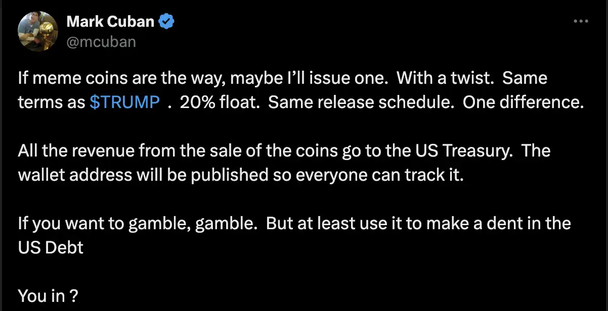 小牛队老板、硅谷知名投资人马克库班在 X 上对$Trump 的发射也表达了自己发射 MemeCoin 的意愿,机制基本相同,唯一的区别就是将其中所有的获利都去填补美国国库。市场对该做法都十分兴奋,相比于$Trump 可能进到个体的口袋,玩家更希望是更透明的。虽然每个商人的行为大概率不可能不考虑风险与收益,但作为迷因币的叙事确实值得期待。