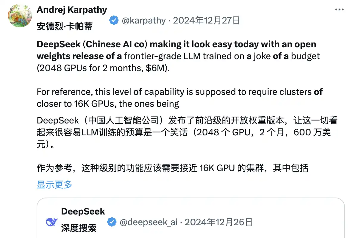 与此同时,许多业内人士正试图深入解析 DeepSeek 的技术报告。OpenAI 前联创 Andrej Karpathy 则在 DeepSeek V3 发布后曾表示:
