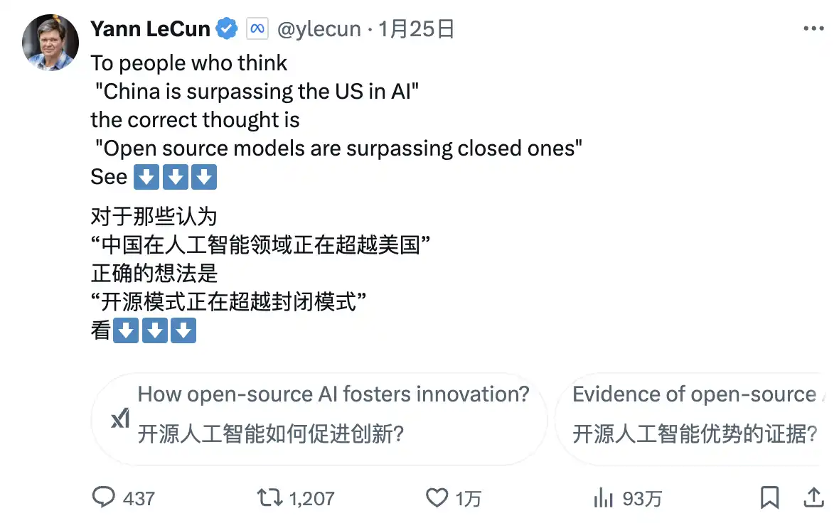 「给那些看到 DeepSeek 的表现后,觉得「中国在 AI 方面正在超越美国」的人,你们的解读是错的。正确的解读应该是,「开源模型正在超越专有模型」。」