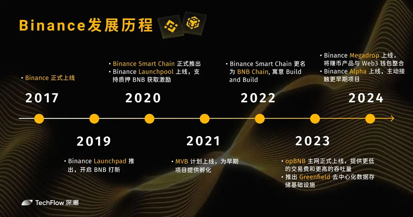 2017 年,Binance 起于交易平台,2021 年开始深入链上生态,DeFi/NFT 成为实际工具,2024 年是 AI 和 Meme 以及 DeSci。