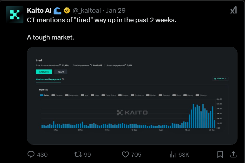 正如 Kaitoai 强调的那样,在 2025 年 1 月的最后两周,"厌倦"这个词在加密推特上的提及增加。