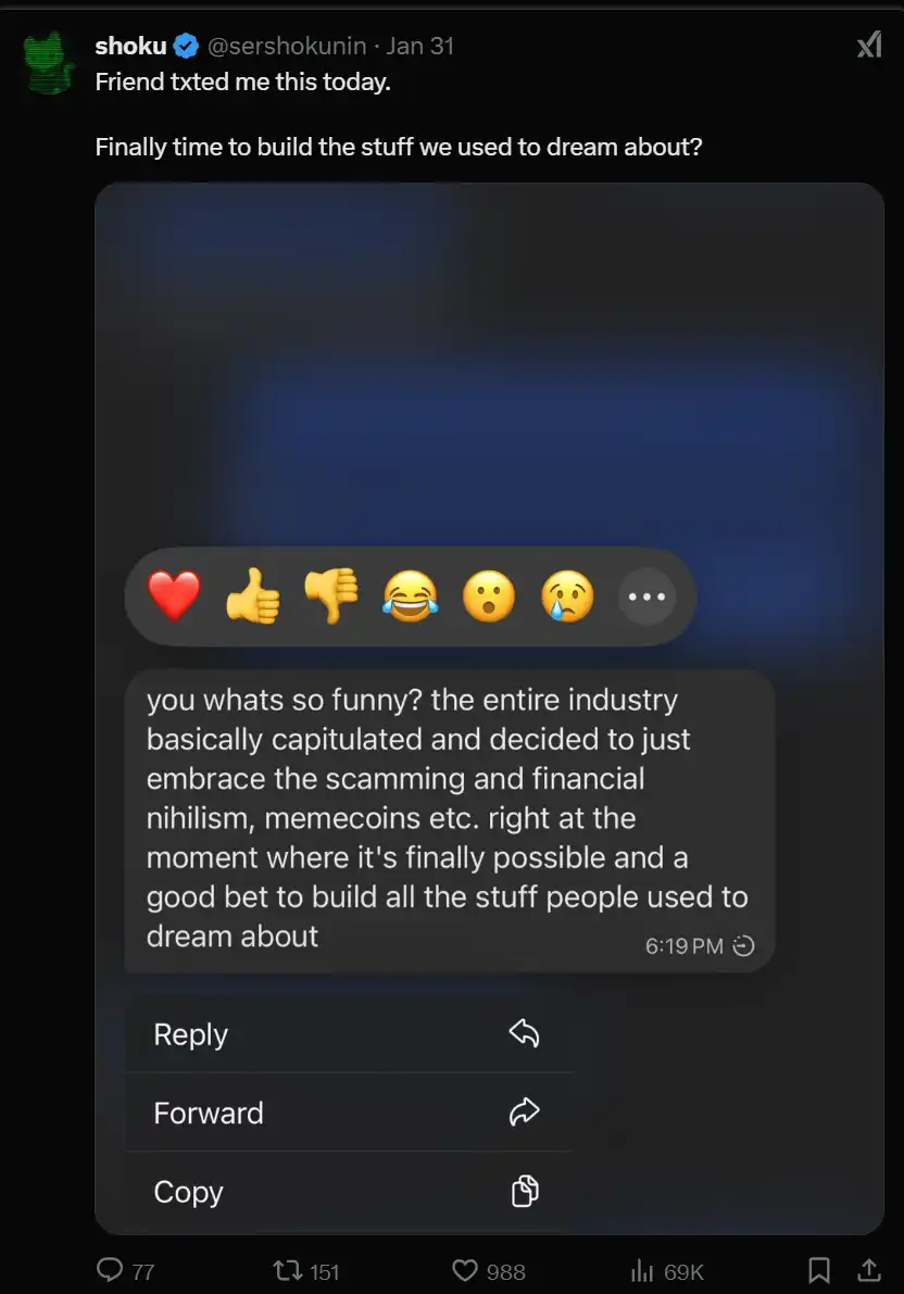 现在剩下的是什么?变得更加倾向于冒险,进一步缩短注意力范围,流动性被进一步分散,同时试图通过更多伪装成「交易」的赌博来理解曾经犯过的错误。