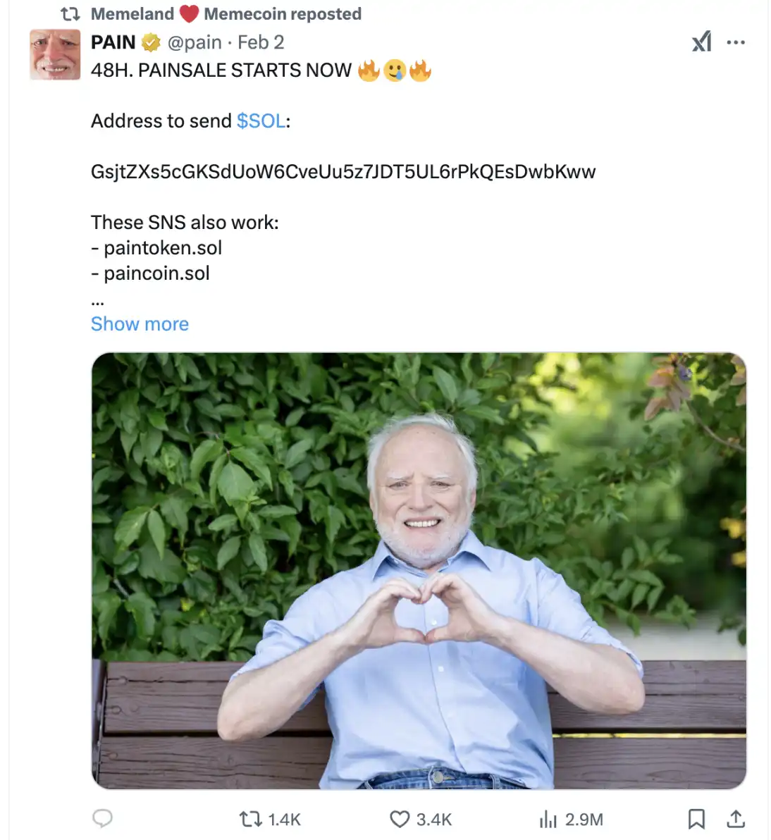 2025 年 2 月 2 日,一场加密社区瞩目的 Meme 币预售拉开序幕。由 Memeland 孵化的 PAIN 项目在 48 小时内狂揽 18.6 万枚 SOL(约 3800 万美元),跻身史上规模最大的 Meme 币预售之列。然而,项目方随后宣布了一项颠覆性决策:退还 80% 募资,仅保留 20% 用于启动与流动性。这一操作既引发了对项目方「诚意」的讨论,也让 PAIN 迅速成为流量焦点。