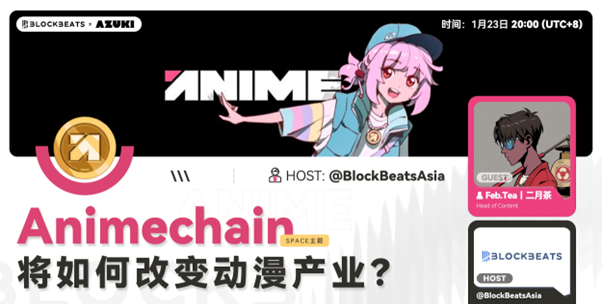 1 月 23 日, 邀请到 Azuki 的内容负责人二月茶,以《Animechain 将如何改变动漫产业?》为主题,聊聊 Azuki 以及 Animechain 的最新动态和未来发展方向。