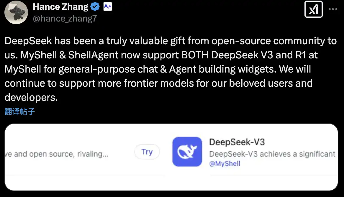 在聊天机器人以及应用插件的制作流中加入了 V3 和 R1 甚至还有图像生成模型 Janus-Pro,Myshell 的技术人员几乎是在半天时间内就完成了模型集成,作为区块链中少有的始终坚持打磨产品,甚至在 Web2AI 的产品中都打出名声而迟迟不愿意发币的项目,而这次 DeepSeek 的开源将在成本端给 Myshell 的使用者带来福音,更低的成本将为原本产品已经完善的 Myshell 带来更多的 Agent 开发者。
