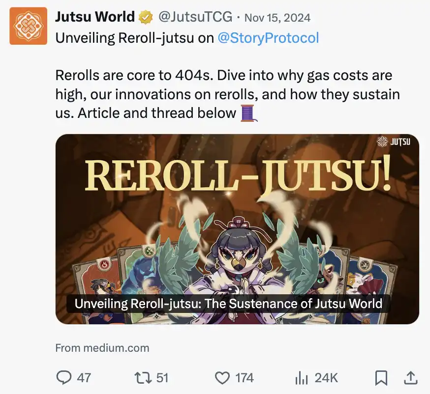 @JutsuTCG 是 Story 生态中的链上卡牌游戏,采用增强版 ERC404,提供动态重投机制,增强游戏体验。