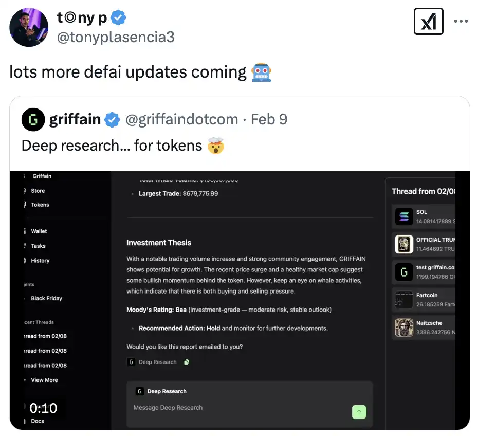 Griffain 推出了用于代币分析的深度研究插件,并且还有更多功能即将发布。