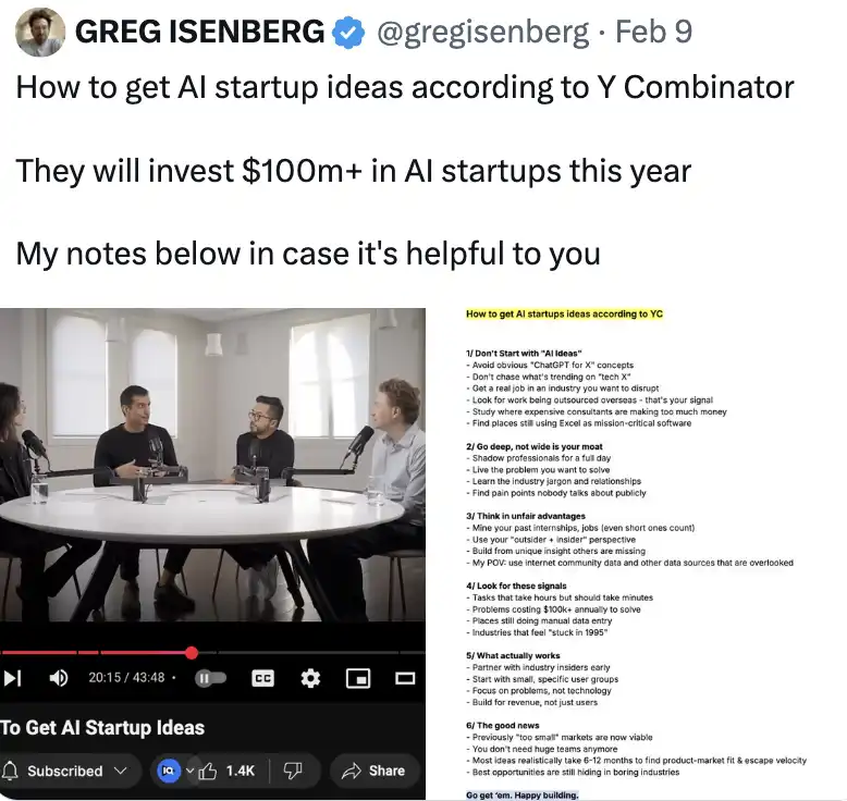 YCombinator 分享了关于如何构建 AI 相关解决方案的建议:「全天跟踪专业人士……亲身体验你想要解决的问题。」