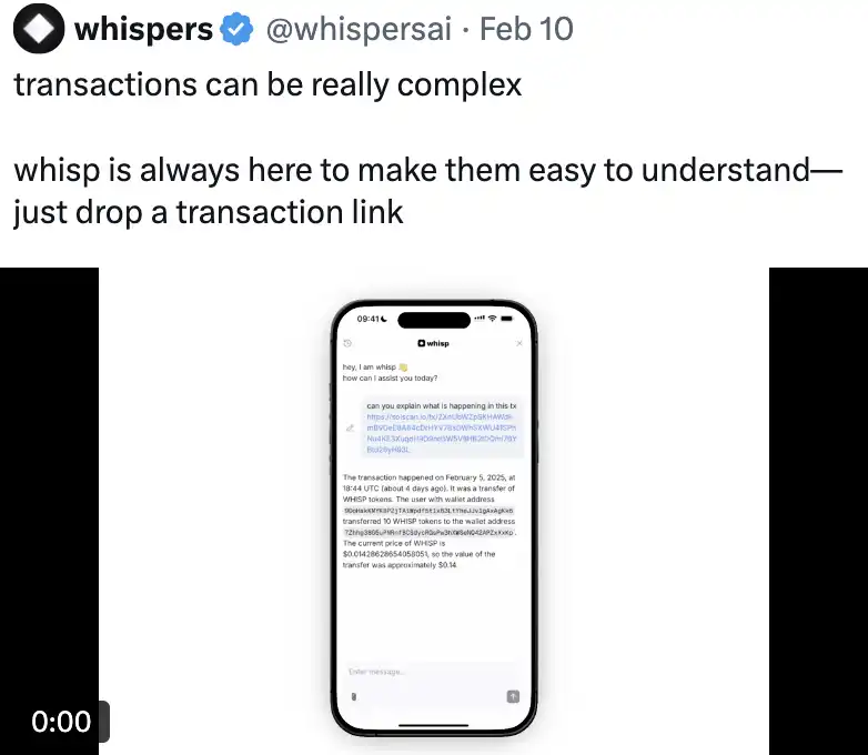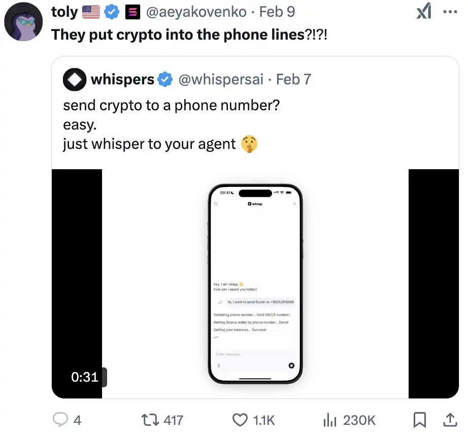 本周的顶级表现者是 whispersai,他们在 DeFAI 解决方案的手机集成方面取得突破,甚至引起了 Solana 创始人 Toly 的惊叹:「他们把加密货币接入电话网络了?!?」——@aeyakovenko