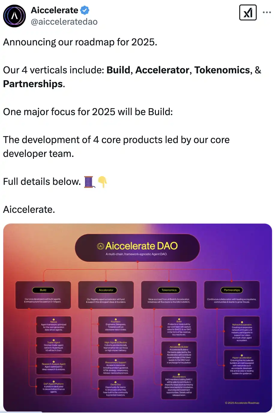 aicceleratedao 公开了最新路线图,并表示很兴奋能参与其研究工作,尤其期待跟踪核心团队在智能体开发上的内部进展——他们的专业深度相当值得关注。
