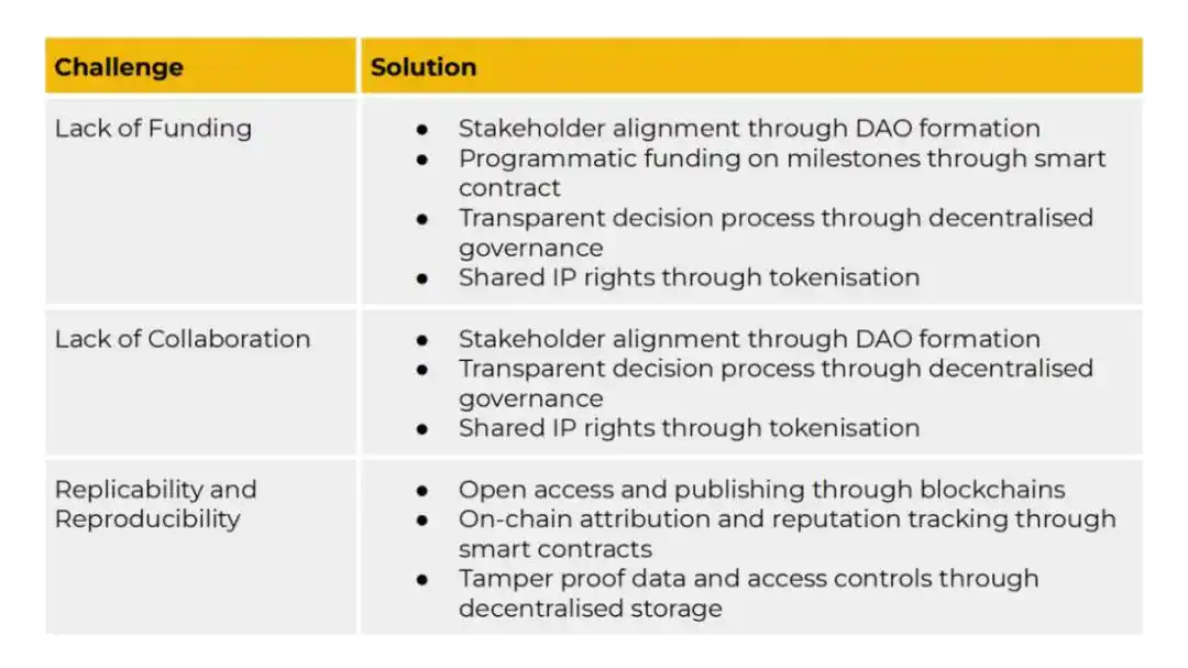 如前所述,大多数研究在「死亡之谷」失败,因为激励机制不一致,导致资金不足、合作减少、科学结果的可复制性和可重复性差等挑战。DeSci 可以通过使用去中心化自治组织 (DAO)、区块链和智能合约来解决这一协调问题。