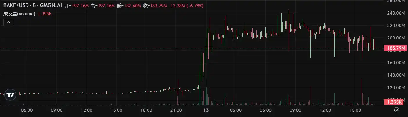 BakerySwap 是一个 Binance 智能链上带有流动性挖矿的自动做市商,BAKE 是平台的原生 BEP-20 治理代币。BakerySwap 是 Uniswap 的迭代,类似 Uniswap 但更快、更便宜。此外,BakerySwap 还有着强大的 NFT 超级市场,包括数字艺术品 NFT、游戏化 NFT 以及最新特色艺术家系列等。BAKE 代币于 12 日晚间突然上涨,2 小时内市值从 110M 美元左右上涨至最高 232.48M,涨幅超过 100%。