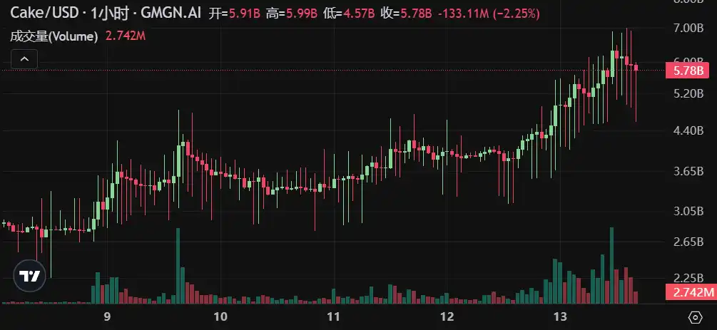 PancakeSwap 是 BNB Chain 上最受欢迎的 AMM 协议之一,也是整个 DeFi 行业中广泛使用的 DEX,CAKE 是 PancakeSwap 平台的原生代币。PancakeSwap 具有低交易费用(0.2% 的交易费)和丰富的功能(如 farm、彩票、NFT 市场等),交易量与用户活跃度持续领先。13 日午间,CAKE 市值最高达到 70 亿美元,截至撰稿,24h 涨幅达 38%。