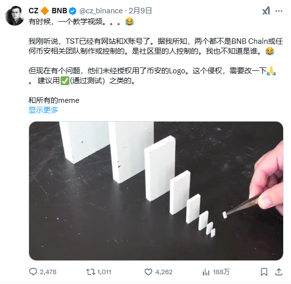 要想溯源这一轮 BNB Chain 热潮,就不得不提到 TST。TST,Test Token,最初不过是一个演示如何在 Four 平台上发行 Meme 的视频中用的代币,但视频不经意间暴露了 TST 的合约地址,这让大家敏锐地捕捉到了一丝机会。很快,TST 从一个无人问津的测试币变成了炒作的焦点,TST 的市场关注度迅速攀升。当 CZ 在社交平台上发布声明,澄清 TST 并非 Binance 官方支持的项目时,本该是降温的时刻,没想到反而成为了 TST 再次爆火的催化剂,更让 TST 在社区中更加声名鹊起。在 2 月 6 日,它的市值仅为 50 万美元,CZ 对 TST 代币的回应,使其市值一度突破 5000 万美元。紧接着,2 月 9 日 Binance 宣布上线 TST,TST 市值一路狂飙,突破 5 亿美元,短短 3 天时间涨幅超 100 倍。