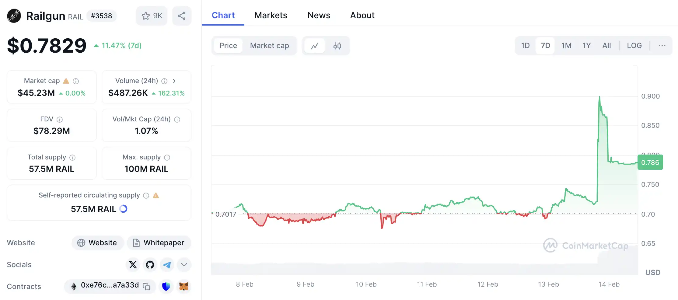 Vitalik 发文之后,市场对该消息的反应十分敏感,Railgun 应声上涨。据行情数据显示,截至发稿,过去 24 小时,Railgun 涨幅为 7.00%,交易量增长 162.31%。
