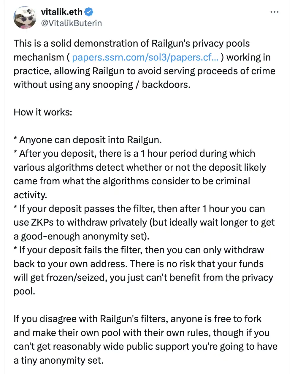 2 月 13 日,一贯为 Railgun 站台的以太坊联创 Vitalik 在社交媒体发文,专门解释 Railgun 本次如何成功避免处理犯罪所得资金。