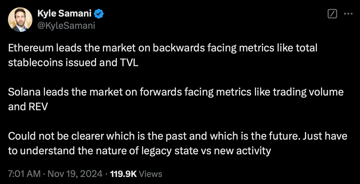 这支持了这样一种观点:DeFi 用户有不同的类别。虽然 Memecoin 交易者越来越多地涌向 Solana,但大量资金依然留在以太坊上。引用 REV 或 DEX 交易量作为 Solana 在 DeFi 中占主导地位的证据,具有误导性。