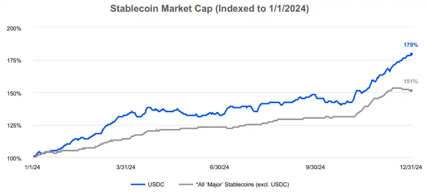 第四季度订阅和服务收入为 6.41 亿美元,环比增长 15%。第四季度稳定币收入环比下降 9% 至 2.26 亿美元,但全年同比增长 31% 至 9.1 亿美元。总体而言,USDC 是 2024 年增长最快的「主要」稳定币。第四季度稳定币收入的推动力是 USDC 平均市值和产品套件中 USDC 资产的大幅增长。