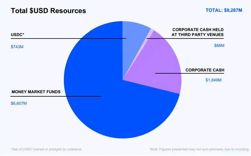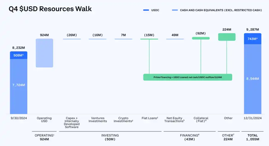 在资本和流动性上,Coinbase 第四季度末,美元资源为 93 亿美元,美元资源被定义为现金和现金等价物以及 USDC(扣除作为抵押品借出的或质押的美元)。美元资源环比增长 13% 至 11 亿美元。
