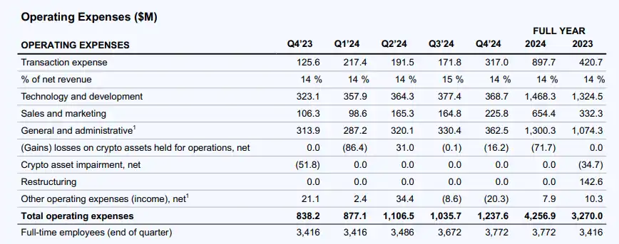 2024 年总运营费用为 43 亿美元,同比增长 30% 至 10 亿美元。技术与开发、一般与行政以及销售与营销费用合计同比增长 25% 至 6.92 亿美元。增长主要得益于可变领域支出的增加,尤其是 USDC 奖励支出和营销费用以及更高的股票薪酬和政策支出,因为加大了加密货币宣传力度。年底拥有 3,772 名全职员工,同比增长 10%。