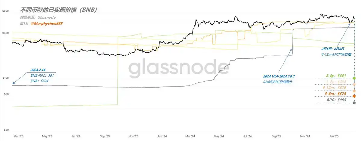 3-6m 的成本是$575,2-3y 成本是$301;同样的,所有长期持币群体的平均成本都要低于当前 BNB 的价格。其中有个细节,在 2 月 5 日~2 月 8 日这几天时间里,BNB 价格跌至$570 左右正好在 6-12m 的 RPC 线产生了支撑,随后开始反弹。