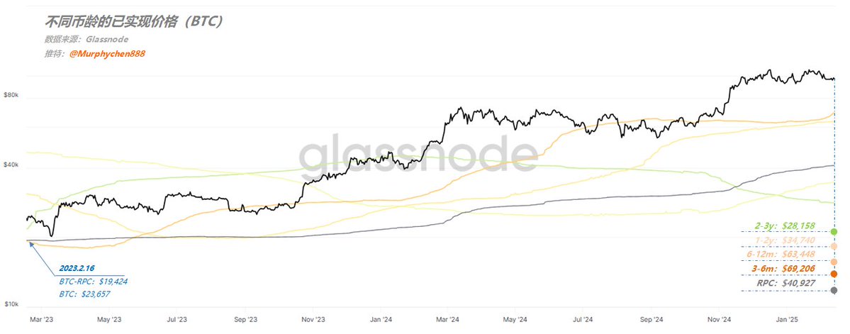 图 1 是 BTC 的不同币龄(持币时间)的 RPC 数据。可以看到在 4 个长期持有者(LTH)群体中,时间越长平均成本越低。3-6 个月(3-6m)的成本是$69,200;2-3 年(2-3y)的成本是$28,158;也就是,即便哪天熊市 BTC 跌回 3w 美元,这些 LTH 群体还是赚钱的。