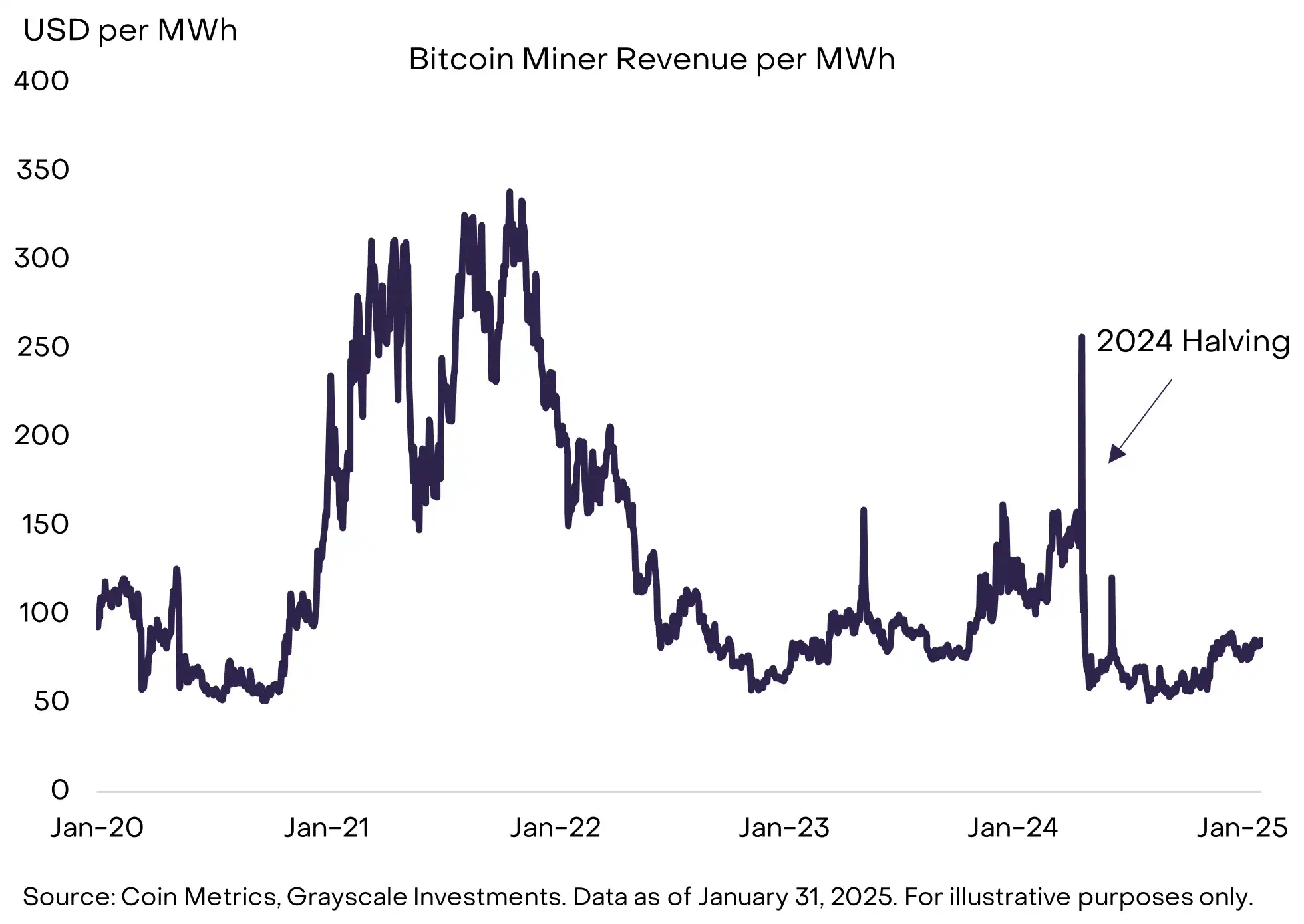 图 4:过去两年,每兆瓦时的矿工收入大致稳定