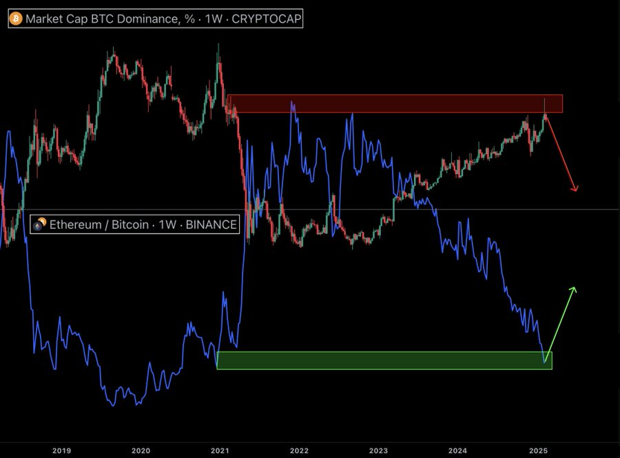 这一点通过比特币的市场份额处于阻力位和以太坊/比特币在支撑位的状态得到体现。