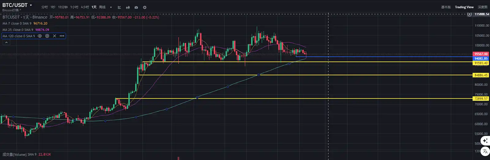 比特币:虽遭遇 3.2% 的周度跌幅,但仍旧在 120 日均线(约 93000 美元)之上。