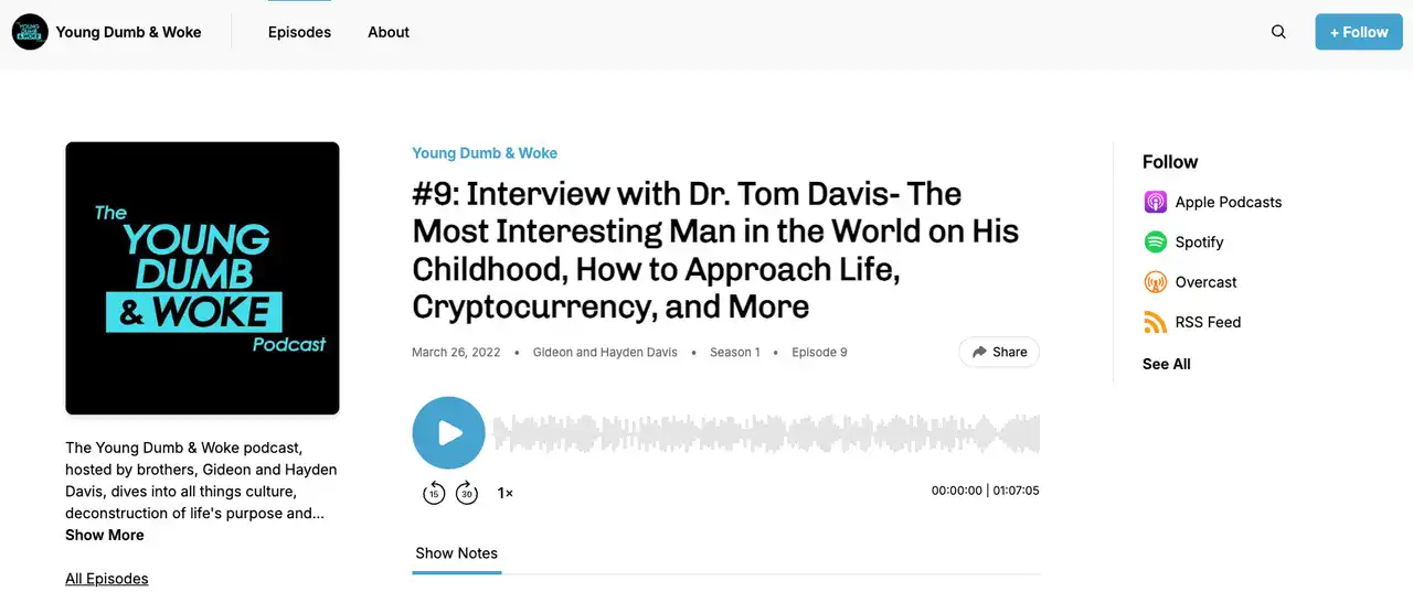 在前文提到的,Hayden Davis 与弟弟 Gideon Davis 的兄弟档播客《Young Dumb & Woke》的第 9 期中,兄弟二人采访了他们的父亲 Tom Davis 内容中,介绍了自己是如何进入加密行业的: