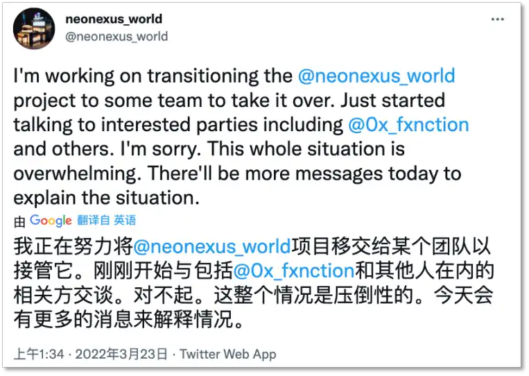 然而,在 2022 年 3 月 21 日,NeoNexus 创始人 Jack Shi 突然宣布因「资金不足」停止运营,并解雇了所有员工,声称愿意将项目移交给社区。