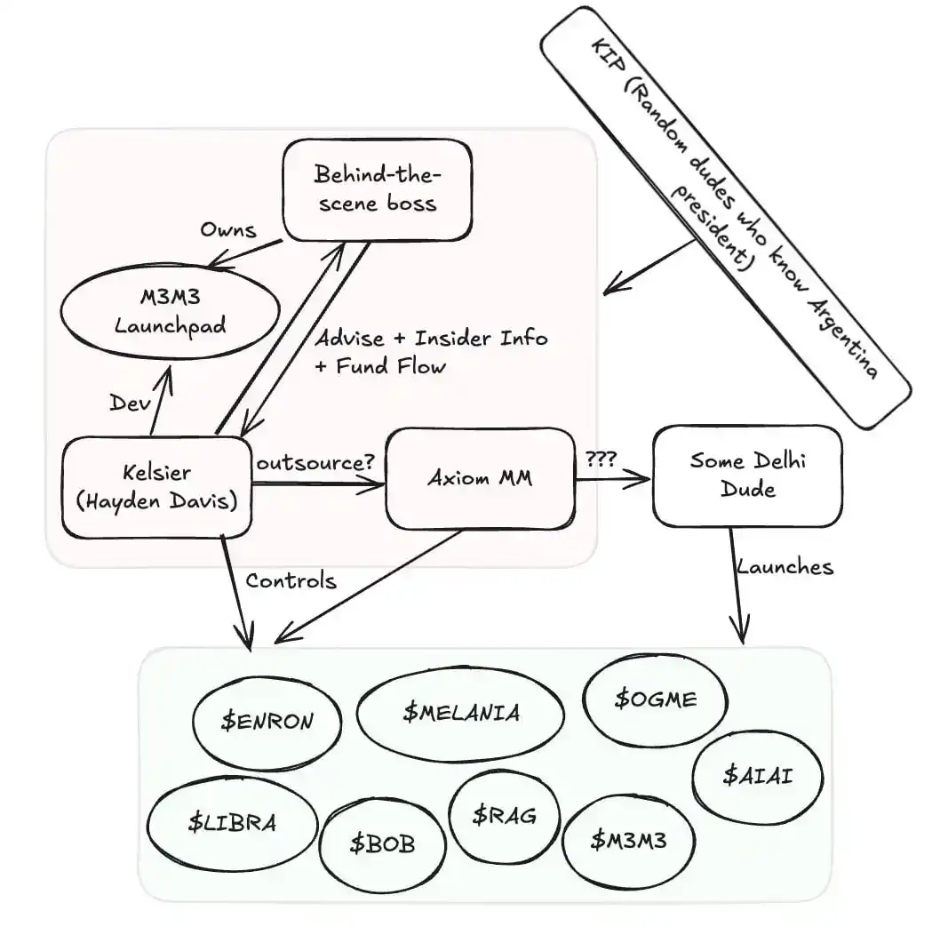 据 Chaofan Shou 曝光信息显示,M3M3 Launchpad 实际上是 Kelsier Ventures 用于操纵 memecoin 的重要平台,它成为了一系列代币发射的温床。整个运作架构中,幕后操盘手 Kelsier Ventures 负责资金调度、信息泄露,并决定何时启动项目,而其 CEO Hayden Davis 则扮演开发者和执行者的角色。此外,Axiom MM 可能在其中充当做市商或中间人,确保市场流动性被操纵,以制造价格波动,而 M3M3 Launchpad 则作为一个「白手套」平台,帮助大量 memecoin 项目如 ENRON、MELANIA、BOB、M3M3、AIAI、LIBRA 等进行代币发行。更值得注意的是,KIP(一个与阿根廷总统米莱政府有关的团体)可能在其中提供政治支持,为该组织在阿根廷市场的运作提供庇护。