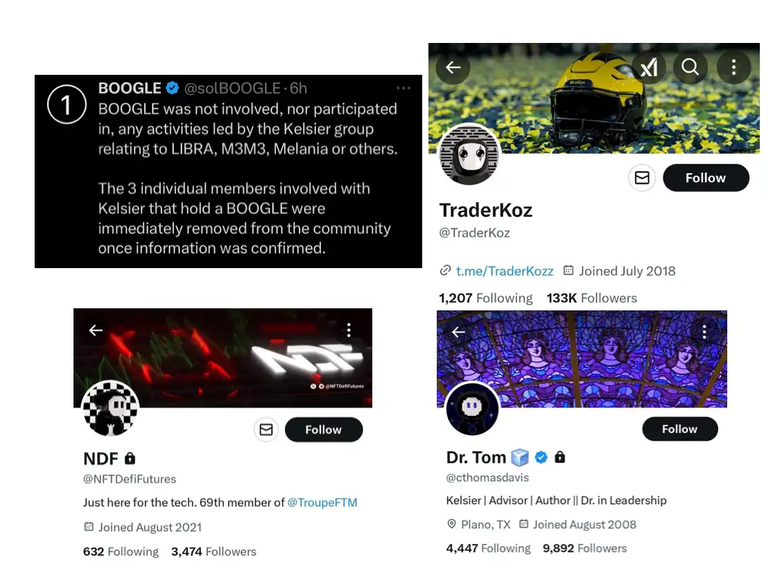 但目前得到了 BOOGLE 的否认:「我们的阴谋集团不参与 Kelsier 或$LIBRA。」但承认三名 Kelsier 相关成员曾是其 NFT 持有者,并表示已将其移除。