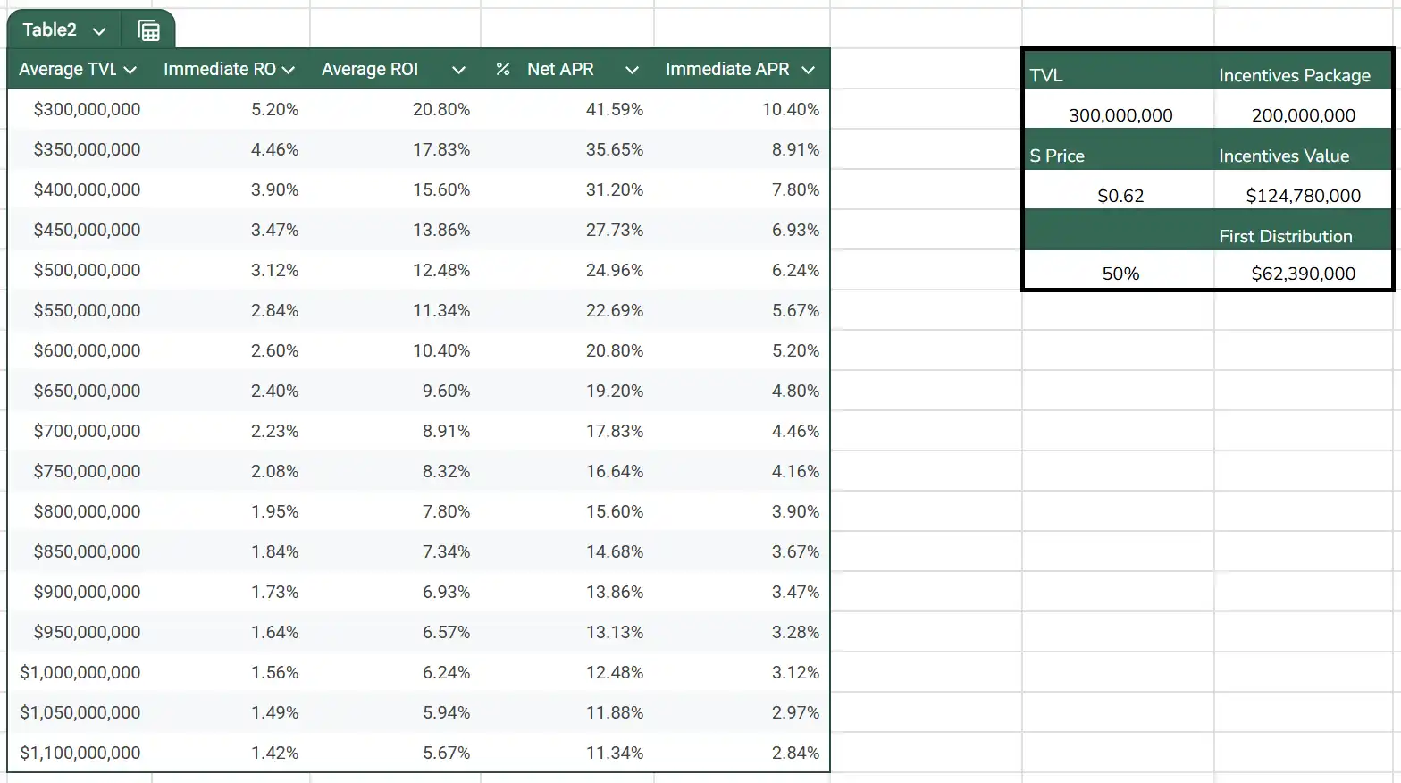 $S 代币目前为完全流通供应,由于没有 VC 份额,所以没有稀释隐患。而当前接近半数的流动性已被锁定「31% 的总供应量在质押+5-10% 的$S 锁定在 DeFi 协议中」。假设 6 个月后空投 50%,那么估算该时间段内的平均积分 TVL 则为当 TVL$300M 时获得额外 20% APR,$500M 时获得额外+12.5% APR。