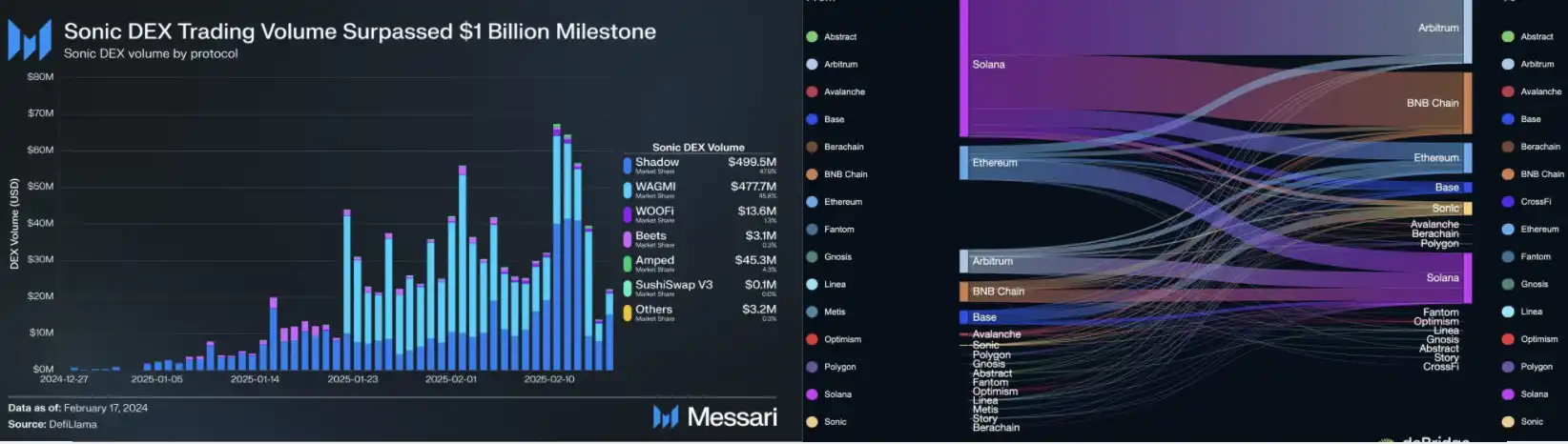 仅仅两个月 Sonic 就从 0 做到了超过 5 亿美元的 TVL,链上共有 1.1 亿美元的外部资金净流入 Sonic,其中 Solana 占多、紧随其后的是 Base 和 ETH。而 Sonic 上的 DEX 交易量也超过了 10 亿美元的大关。
