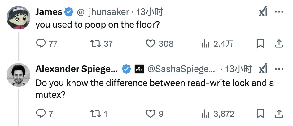 眼见火药味越来越浓,Hunsaker 直接略过技术问题,回怼道:「你以前是拉在地上吗?」此时的 Spiegelman 已经十分无语,无奈反击道:「你知道读写锁和互斥锁的区别吗?」这次对面的 Hunsaker 没再回复。