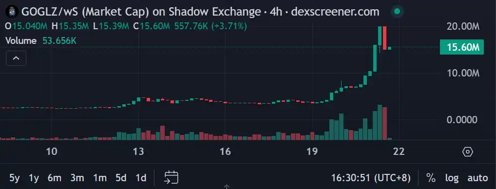代币$GOGLZ 于 19 日中午开始拉涨,市值从 4.18M 美元上涨至最高 18.58M 美元,两日内最高涨幅达 344%。目前市值略有回调,截至撰稿,市值为 15.6M 美元。