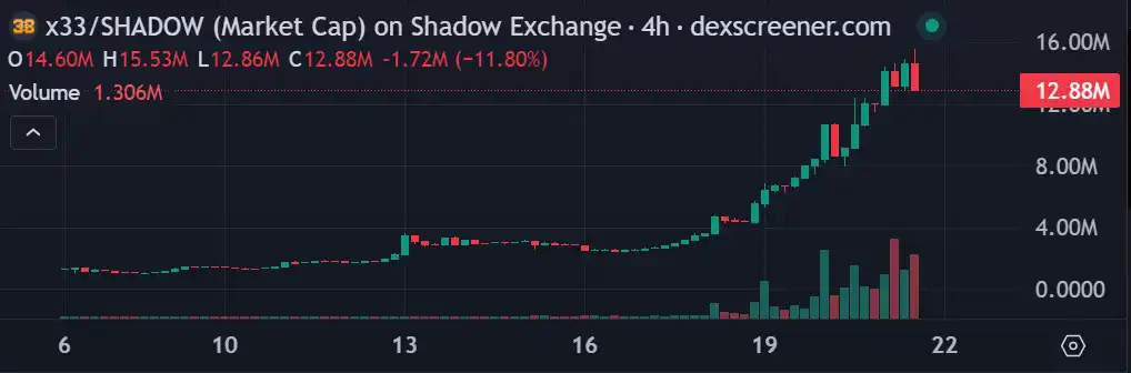 $x33 的市值也随着 Sonic 链和 Shadow Exchange 的热度上升而不断拉涨,一周内市值从 3M 美元左右一路突破至最高 15.53M 美元,最高涨幅超过 400%,目前市值在 12.88M 美元左右。