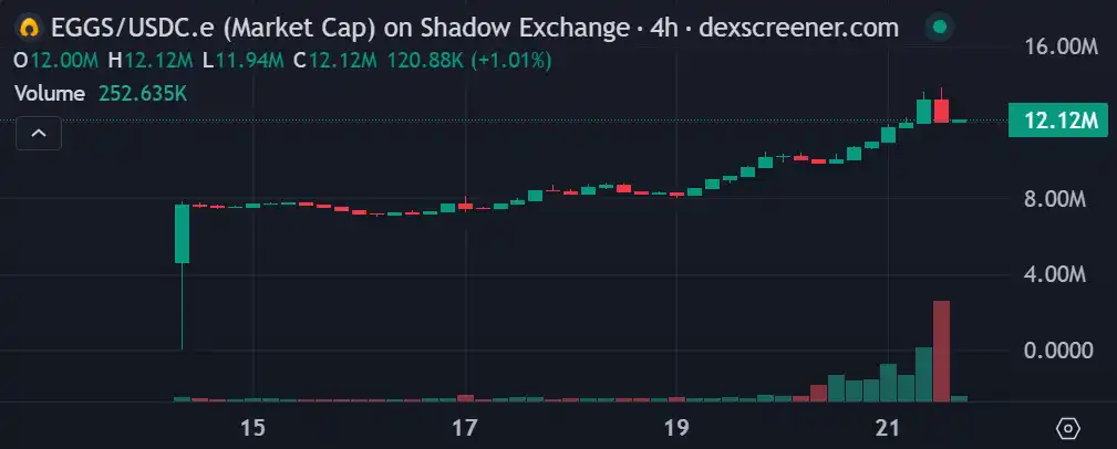EGGS 代币上线后首日市值迅速突破 7M 美元,并不断波动上涨,目前市值为 12.12M 美元,一周内上涨 58%。