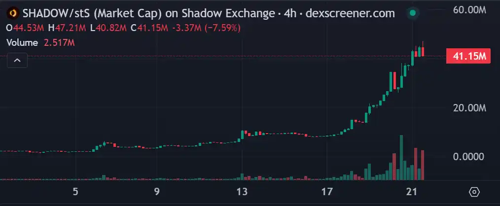 $SHADOW 的市值在一周内从 5M 美元左右上涨至目前 41.15M 美元,上涨幅度超过 700%,最高市值达 47.21M 美元。$SHADOW 作为 Sonic 链最大交易所 Shadow Exchange 的原生代币,应用场景广泛,与整个 Sonic 生态的繁荣程度息息相关。