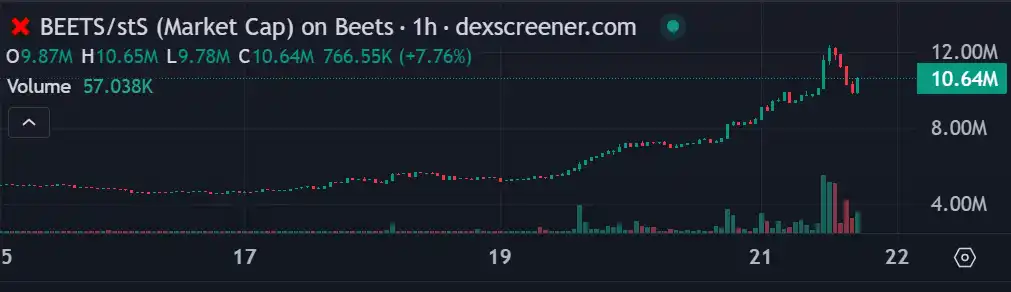 Beets 是一个去中心化交易平台,于 2021 年 10 月在 Fantom 网络上以 Beethoven X 启动。此后,该协议跨链发展,并于 2022 年 7 月部署在 Optimism 上,2024 年 12 月又从 Fantom 迁移至 Sonic,由 Balancer v3 提供无需许可的技术以简化 AMM 开发。其在 Sonic 链上的 24H 交易量为 14.46M 美元,24H 交易费约 2 万美元,TVL1.65 亿美元。用户可在 Beets 上质押 stS 代币并获得收益。目前 BEETS 代币市值为 10.64M 美元,三日内上涨 95.6%。
