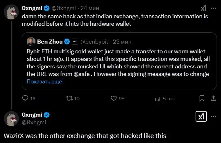 23 时 44 分,在 Bybit 联合创始人兼 CEO Ben Zhou 的公告中显示:「Bybit 的 ETH 多签冷钱包大约 1 小时前进行了转账到我们的热钱包。看起来这笔交易被伪装了,所有签名者都看到伪装的界面,显示了正确的地址,并且 URL 来自 Safe。」