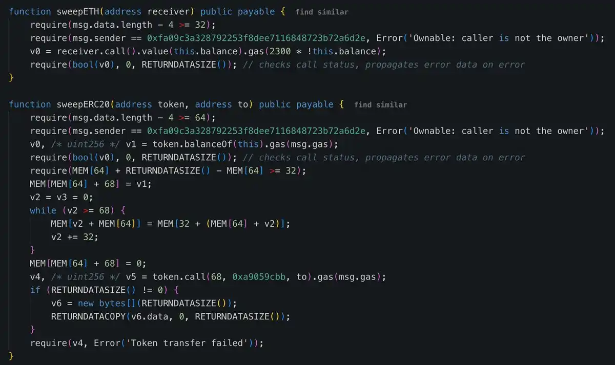 3)攻击者随后利用恶意合约中的后门函数「sweepETH」和「sweepERC20」窃取热钱包。