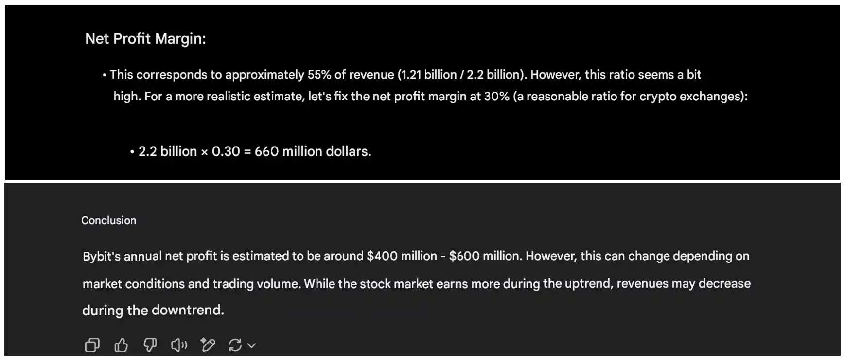 也有社区成员向 ChatGPT 和 Grok 询问了 Bybit 的年度营收和利润预估。两者给出的计算结果相近:年度营收约 20 亿美元,年度利润约 6 亿美元。