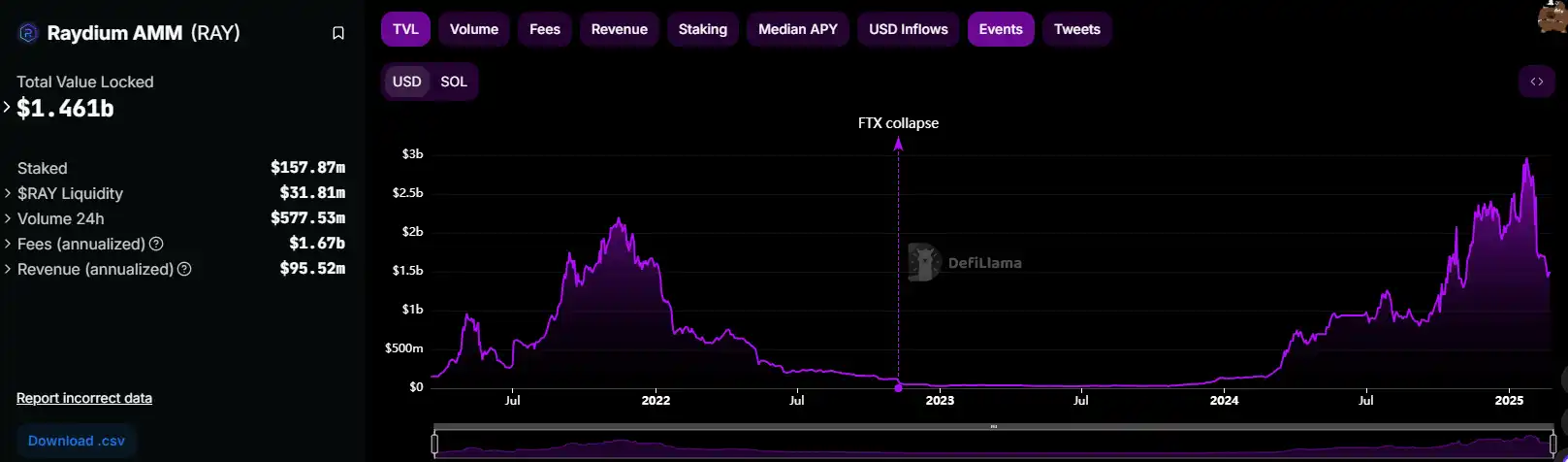 Raydium 本身是 Solana 生态中最重要的 AMM 平台之一,也是 DeFi 用户获取流动性的重要基础设施。它也为 Solana 上的众多项目提供流动性池服务,其 TVL(总锁仓量)长期位居 Solana 前列。