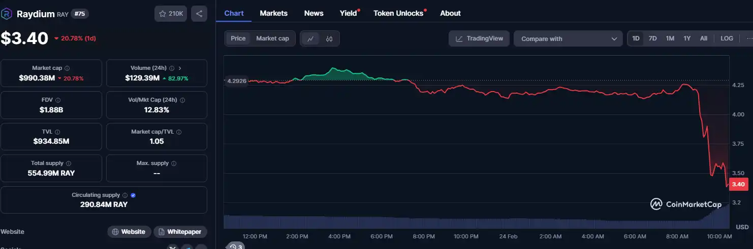 Pump.fun 宣布推出自建 AMM 后,Raydium 的代币 $RAY 应声下跌,目前日跌幅已有 20%。