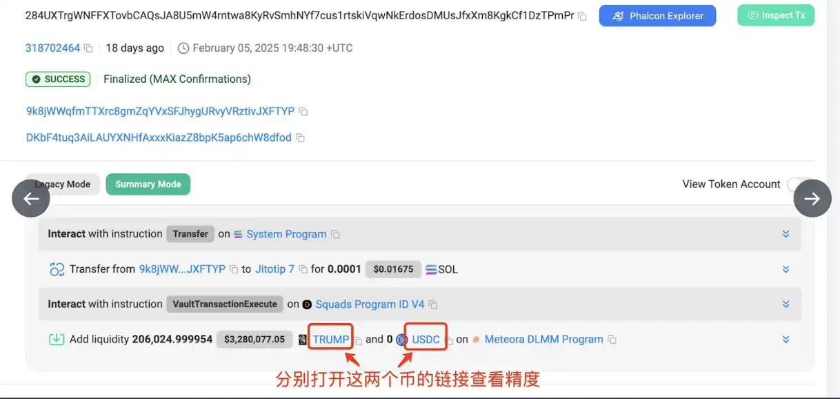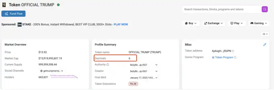 我们分别打开$trump 和$usdc 的链接,可以查到$trump 的精度为 6,$usdc 的精度也为 6,如图