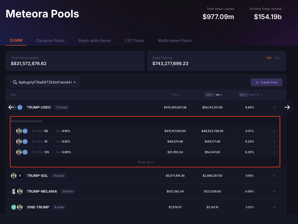 每个交易对下面可以有多个 Pools,每个 Pool 按 Bin Step 和 Fee(手续费)的不同来区分。比如 trump-usdc 的交易对下面就有 57 个 Pools,每个 Pool 都对应一个唯一的地址,如图