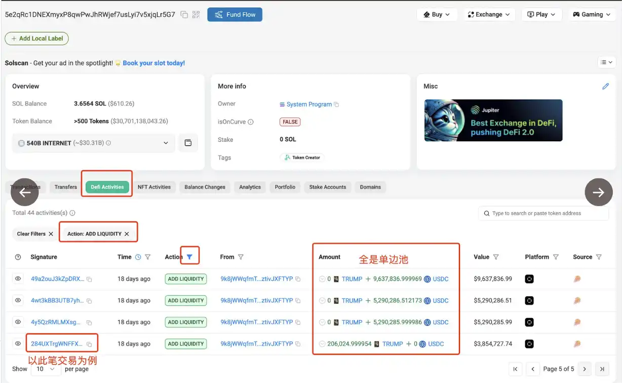 我们打开 solscan,输入$trump 的 dev 地址(https://solscan.io/account/5e2qRc1DNEXmyxP8qwPwJhRWjef7usLyi7v5xjqLr5G7?activity_type=ACTIVITY_TOKEN_ADD_LIQ&page=5#defiactivities),打开【Defi Activities】标签页,【Action】的过滤选中「ADD LIQUIDITY」,在 Amount 那一列能看到列出的加流动性交易全是单边池,要么只添加了$trump,要么只添加了$usdc。本文以图中最后一笔交易为例,如图