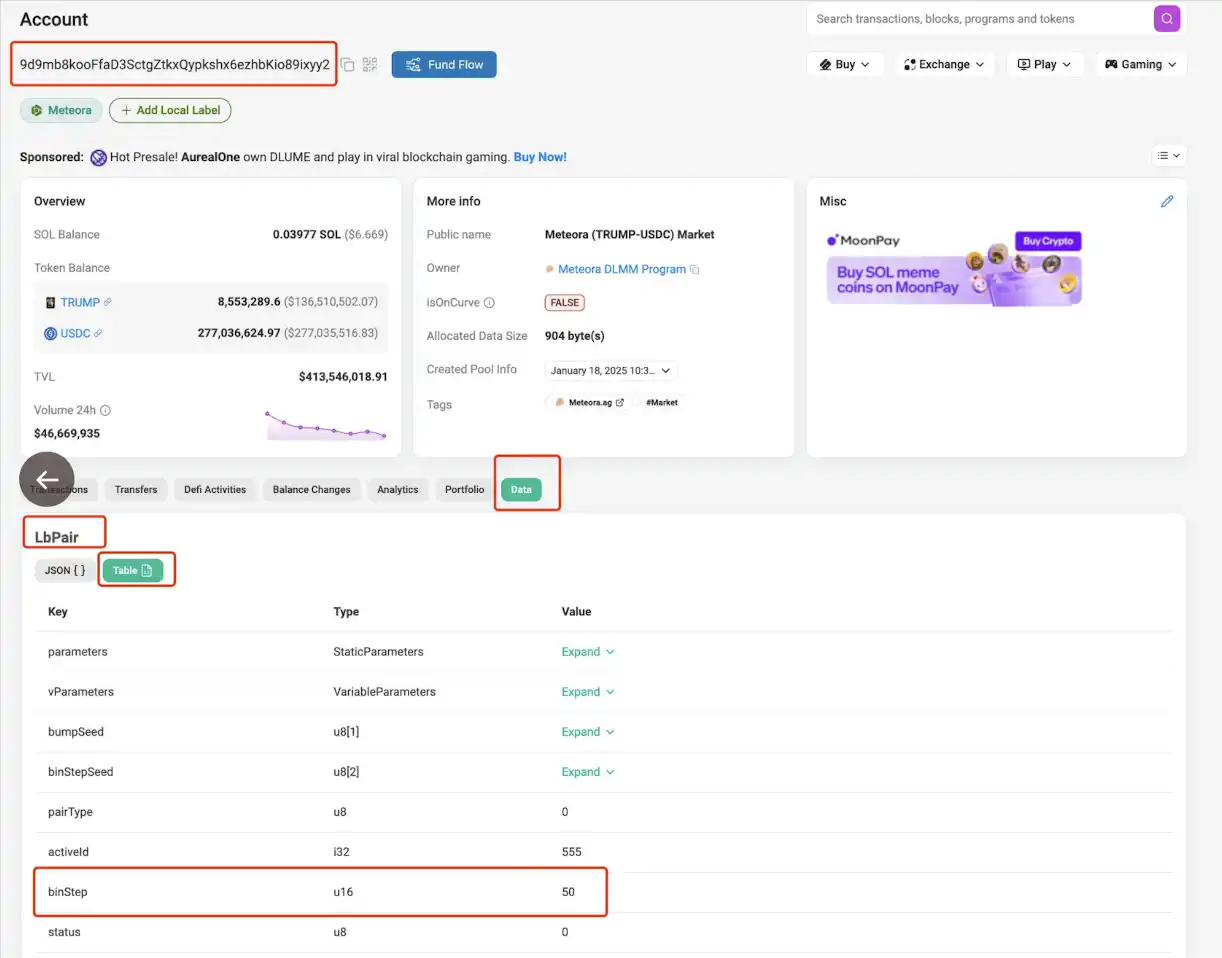 在 solscan 上打开池子地址 9d9mb8kooFfaD3SctgZtkxQypkshx6ezhbKio89ixyy2(https://solscan.io/account/9d9mb8kooFfaD3SctgZtkxQypkshx6ezhbKio89ixyy2),点击【data】标签页,在「LbPair」切换成「Table」,可以查到 binStep 的值为 50,如图